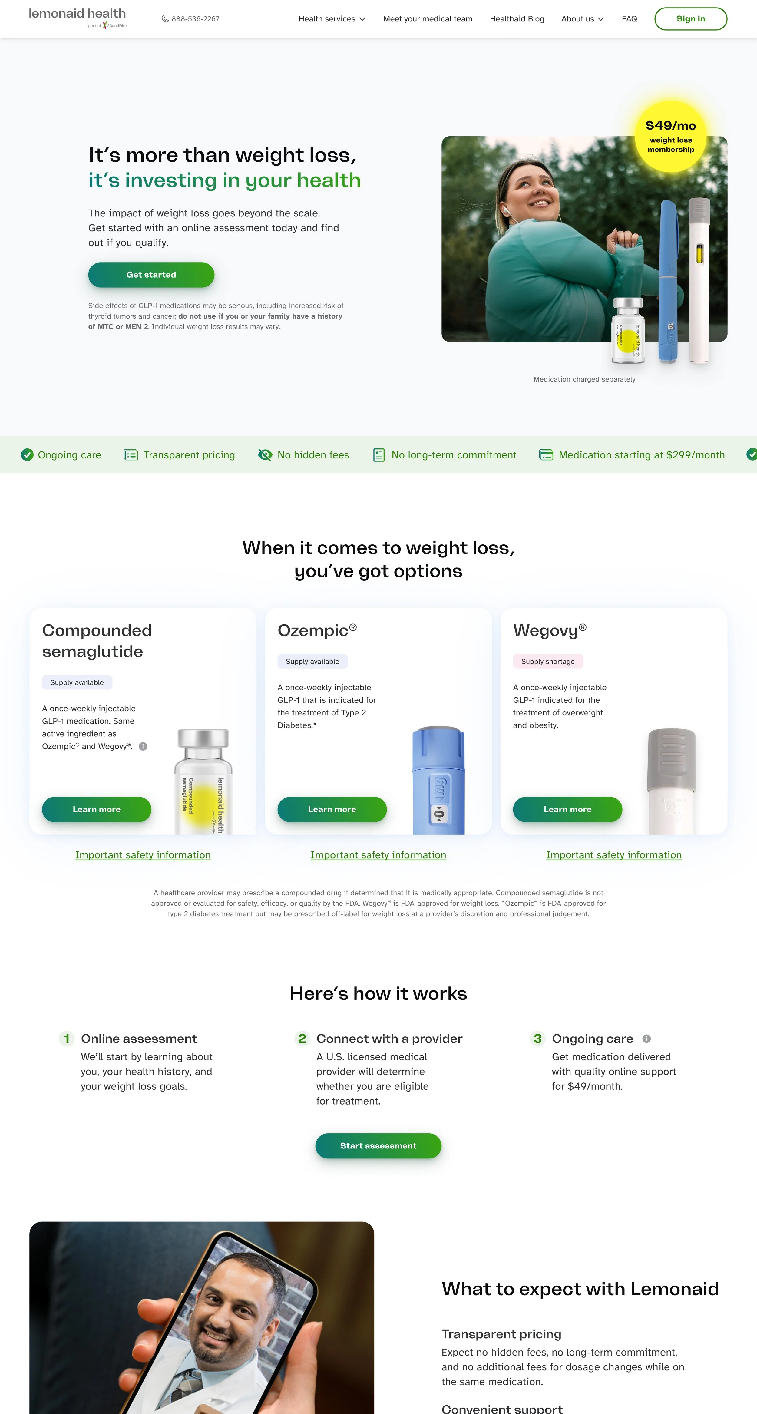 Designed to educate potential patients about GLP-1 medications, the page highlighted their effectiveness in weight loss and additional health benefits, encouraging users to start their assessment.