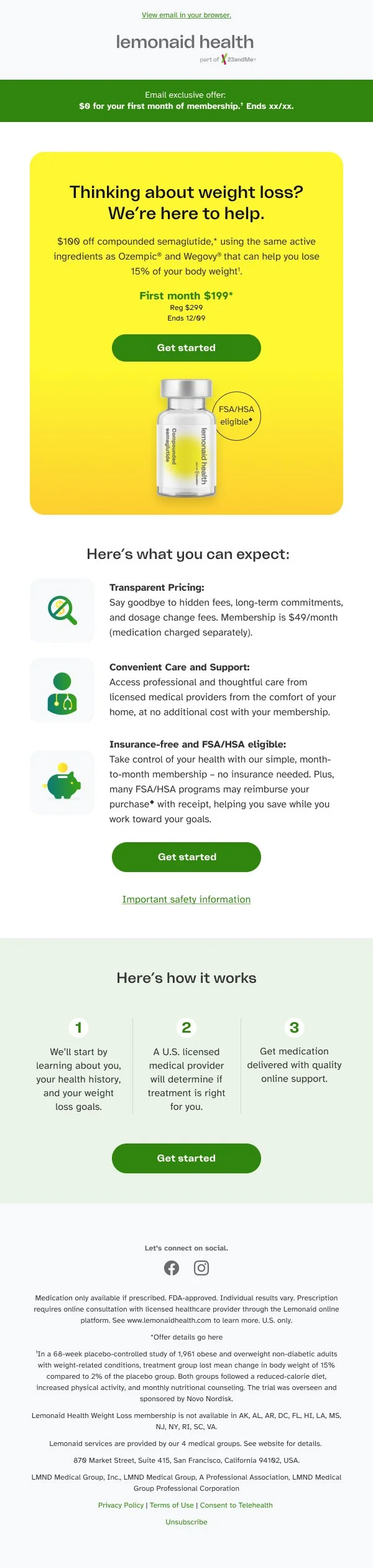 Lemonaid Health’s GLP-1 campaign introduced a comprehensive telehealth service for prescription weight loss medications—including Ozempic®, Wegovy®, and compounded semaglutide. The campaign emphasized both physical results and health benefits beyond the scale.