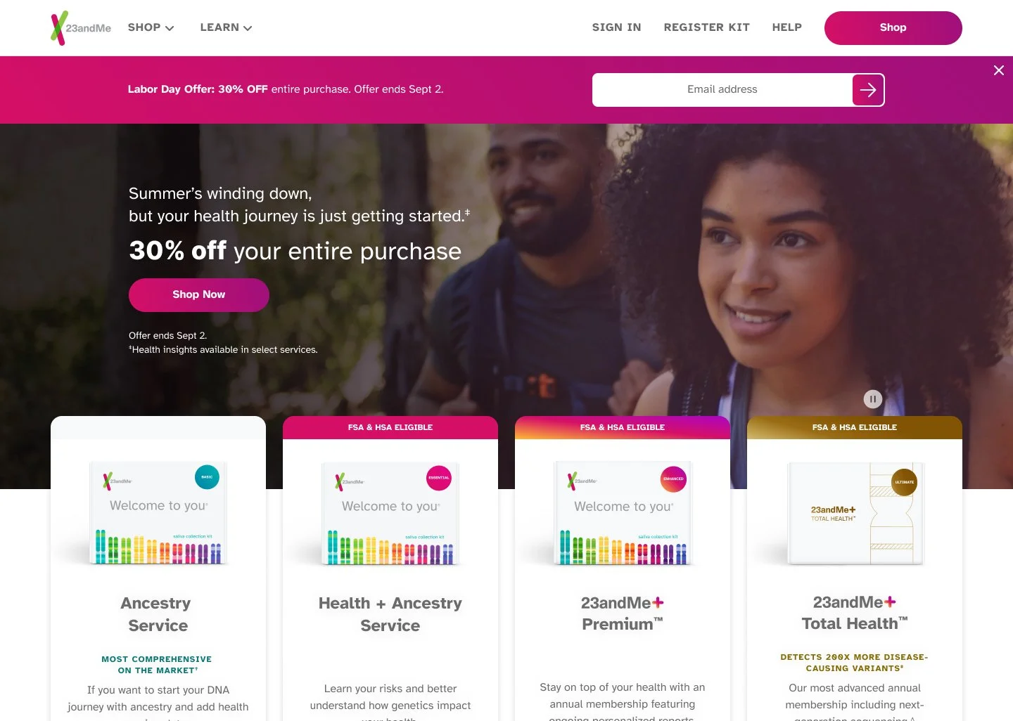 The Labor Day campaign was a limited-time promotional effort designed to drive kit sales during the holiday. Focused on creating a sense of urgency and value, the campaign featured clear and compelling copy to highlight 30% off your entire purchase and the unique benefits of 23andMe’s health and ancestry kits. I collaborated with marketing and design teams to craft attention-grabbing headlines and actionable messaging across email, web, and paid media channels.