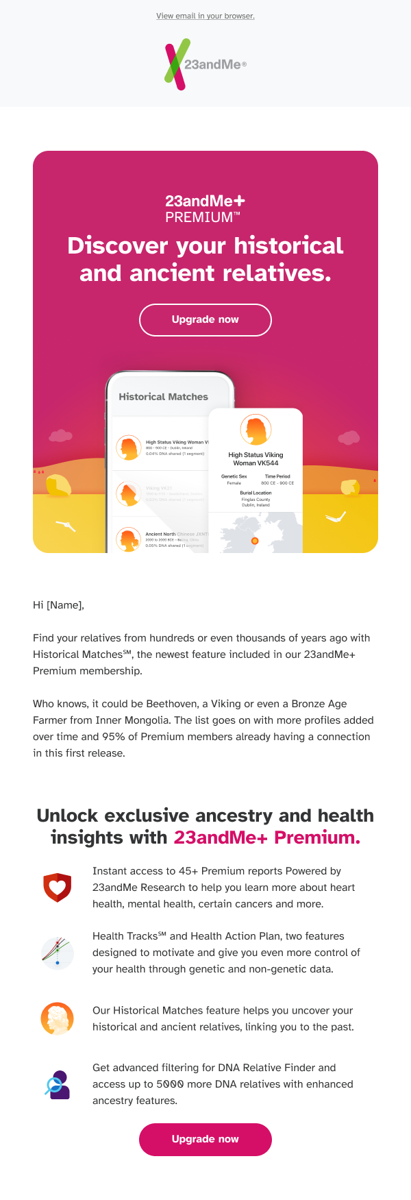 The Historical Matches campaign introduced the first new ancestry feature in years, exclusively available to 23andMe+ subscribers. This feature allowed users to uncover their historical and ancient relatives, exploring their link to the past through DNA connections to individuals from hundreds or even thousands of years ago.